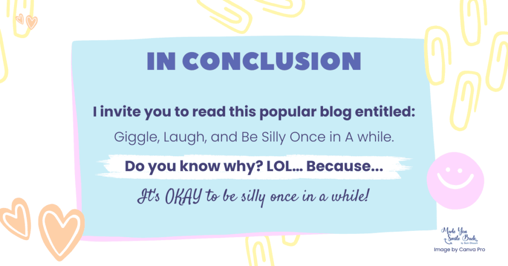 For further reading, I invite you to read this popular blog I myself wrote, entitled: “Giggle, Laugh and Be Silly Once in Awhile.”