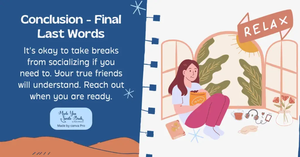 It’s okay to take breaks from socializing if you need to. Your true friends will understand. Reach out when you are ready.