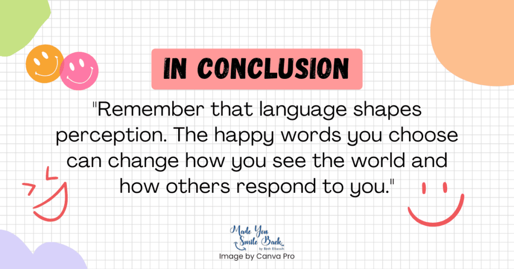 Remember that language shapes perception. The happy words you choose can change how you see the world and how others respond to you.