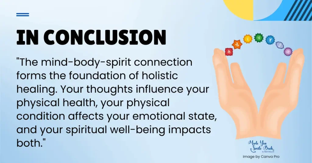 The mind-body-spirit connection forms the foundation of holistic healing. Your thoughts influence your physical health, your physical condition affects your emotional state, and your spiritual well-being impacts both.