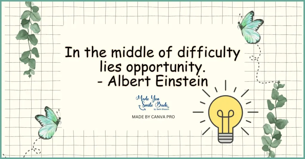 This quote shows Einstein’s positive outlook. When things get tough, look for chances to grow.