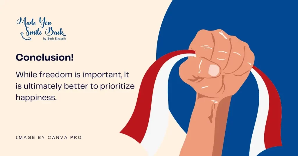 Overall, while the choice between happiness and freedom may seem like a difficult one, it’s important to recognize that they are not mutually exclusive. By pursuing both happiness and freedom in a balanced way, you can live a fulfilling and meaningful life.