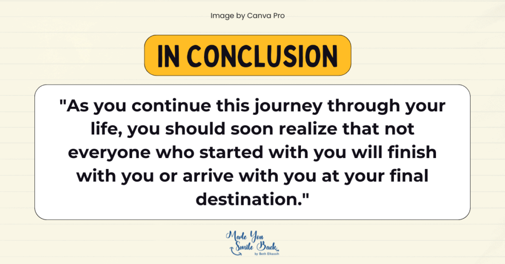 1) “Everyone that’s been in your life has been there for a reason” – Beth Elkassih – Made You Smile Back