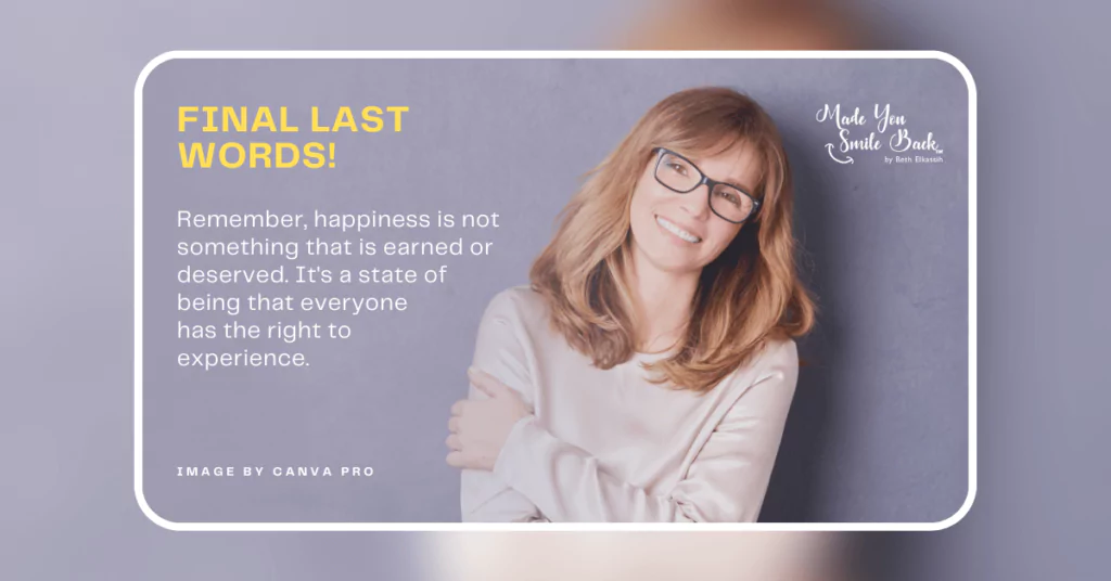 Remember, happiness is not something that is earned or deserved. It’s a state of being that everyone has the right to experience. By taking small steps towards self-love and acceptance, you can cultivate a happier and more fulfilling life for yourself.